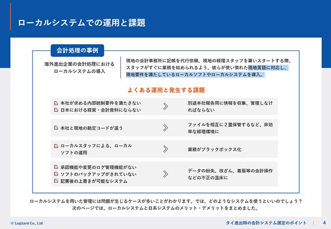 では、グローバルにおける成長戦略を志向される日系企業は、どのようにシステムを選定すると良いのでしょうか。また、ローカルソフトを導入するデメリットは何でしょうか。今回はマルチブック様にご協力いただき、人気が高まっているタイを例に挙げながら、海外拠点管理を始める際の会計システムの選定ポイントについて資料にまとめました。海外拠点管理を検討されている方は是非お役立てください。
