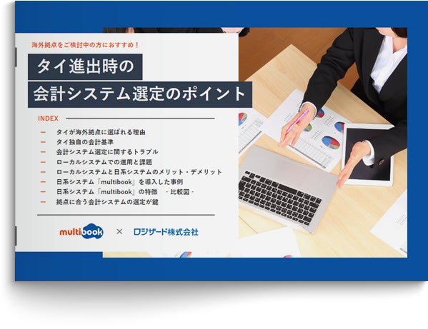 クラウド型在庫管理システムのリーディングカンパニーであるロジザード株式会社(東京都中央区、代表取締役社長:金澤 茂則、以下:ロジザード)は、海外拠点の基幹業務を管理するクラウド型会計・ERPサービスを提供する株式会社マルチブック(東京都品川区、代表取締役CEO:渡部 学、以下:マルチブック)協力のもと、「海外拠点の展開をご検討中の方におすすめ!タイ進出時の会計システム選定のポイント」資料を作成、この度無料公開しましたのでお知らせいたします。