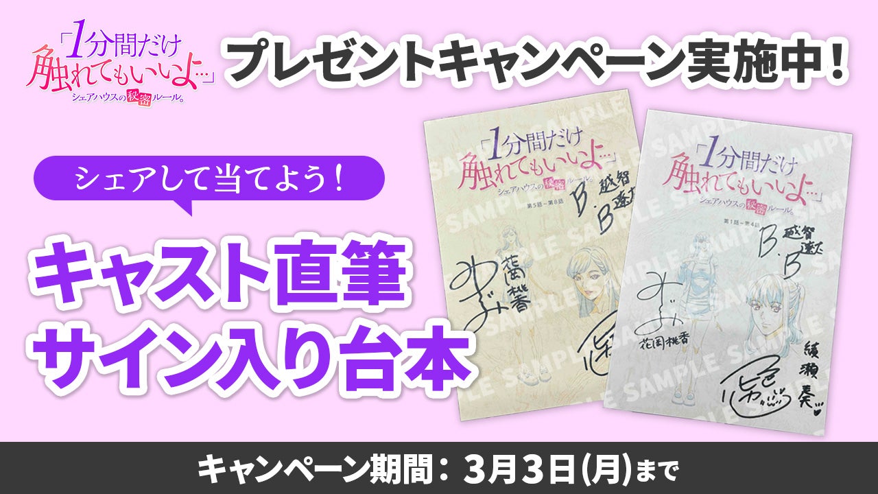 キャストの直筆サイン入り台本が当たる!【2025冬アニメ】『「1分間だけ触れてもいいよ…」シェアハウスの秘密ルール。』地上波放送開始を記念して、AnimeFesta限定プレゼントキャンペーンを開催!