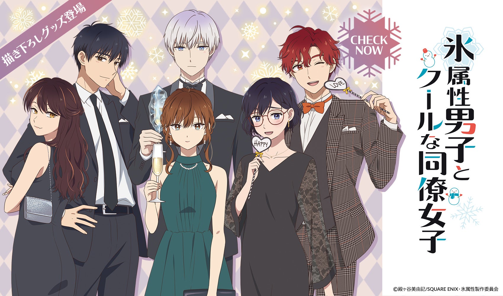 TVアニメ『氷属性男子とクールな同僚女子』の公式グッズとして、ファン待望の新商品ラインナップの予約を開始!Tokyo Otaku Modeオリジナルの描き下ろしイラストは、冬月さん、氷室くん、狐森さん、冴島くん、音無さん、火鳥くんの6人が結婚パーティーに招待された様子を描きました。フォーマルな装いの6人にご注目ください。