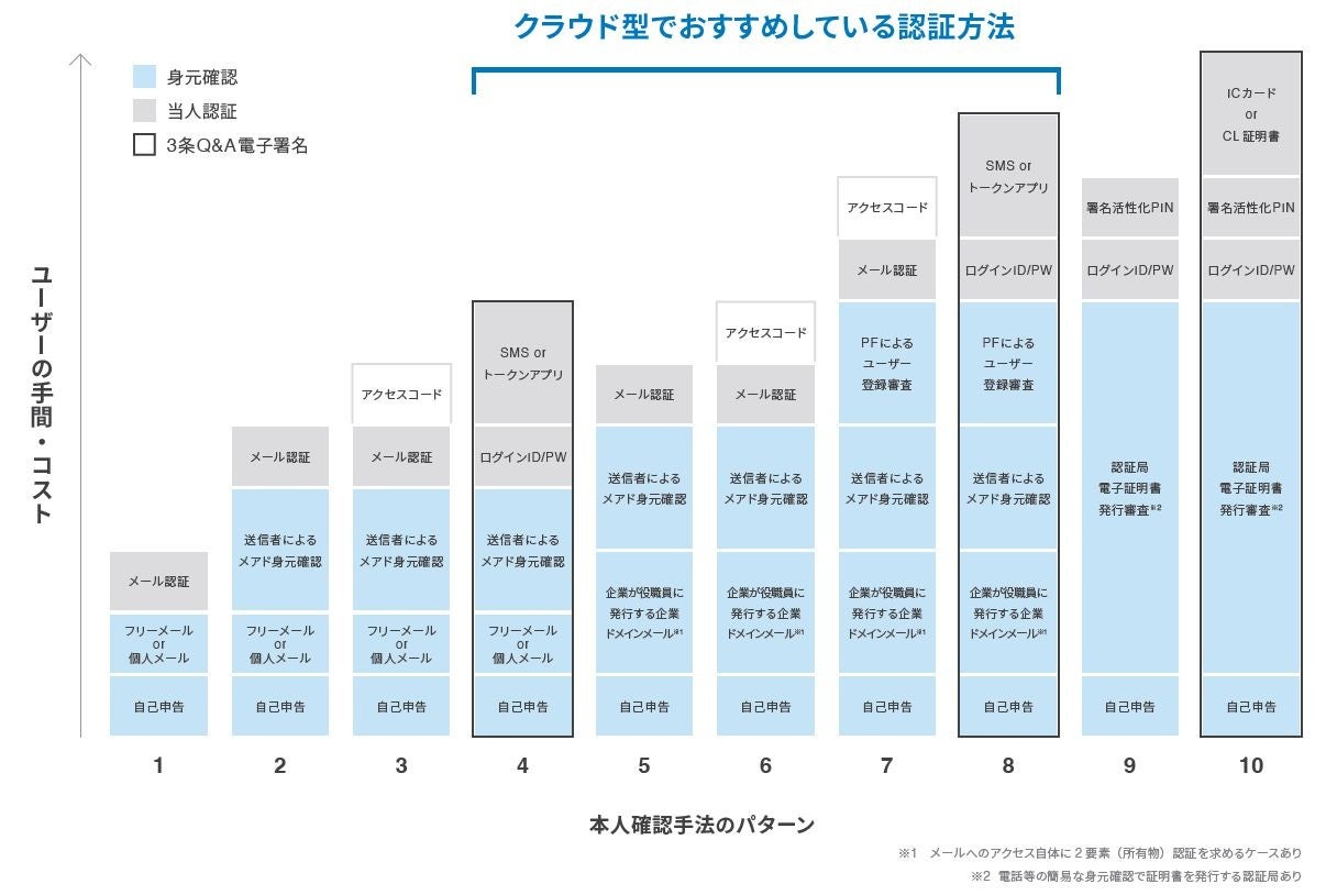 クラウド型電子契約サービスのユーザーは、そのようなリスク評価を前提にしながら、電子契約サービス上で利用可能な様々な認証手段を活用し、又は契約当事者自身におけるリスク低減措置を取り入れることで、有効かつ効果的になりすましリスクを低減することが可能です。