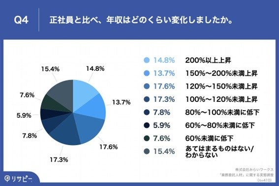 「Q4.正社員と比べ、年収はどのくらい変化しましたか。」(n=410)と質問したところ、「200%以上上昇」が14.8%、「150%~200%未満上昇」が13.7%という回答となりました。