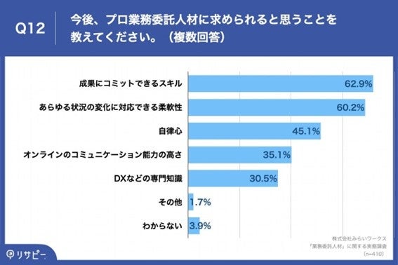 「Q12.今後、プロ業務委託人材に求められると思うことを教えてください。(複数回答)」(n=410)と質問したところ、「成果にコミットできるスキル」が62.9%、「あらゆる状況の変化に対応できる柔軟性」が60.2%、「自律心」が45.1%という回答となりました。