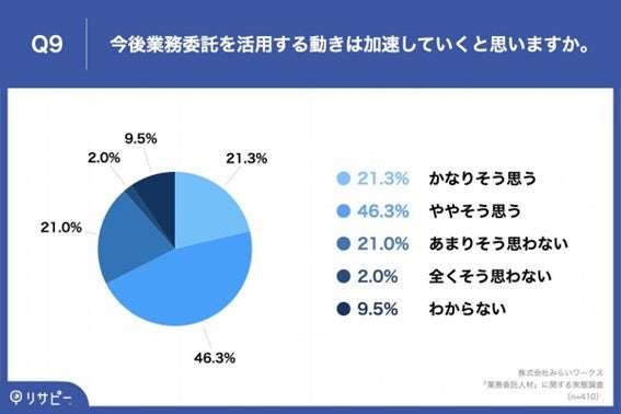 「Q9.今後業務委託を活用する動きは加速していくと思いますか。」(n=410)と質問したところ、「かなりそう思う」が21.3%、「ややそう思う」が46.3%という回答となりました。