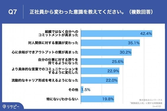 「Q7.正社員から変わった意識を教えてください。(複数回答)」(n=410)と質問したところ、「組織ではなく自分へのコミットメントが高まった」が42.4%、「対人関係に対する意識が変わった」が35.1%、「心に余裕ができアウトプットの質が高まった」が30.2%という回答となりました。