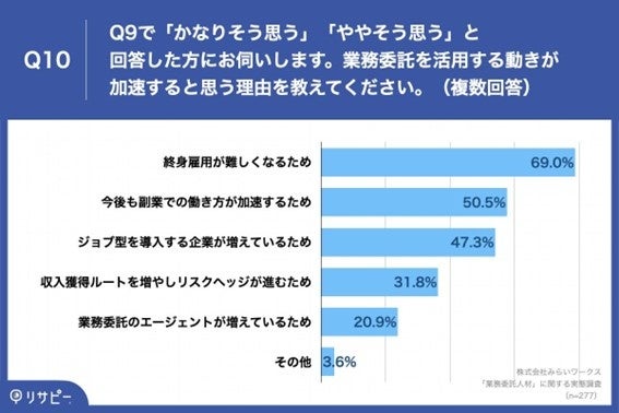 Q9で「かなりそう思う」「ややそう思う」と回答した方に、「Q10.業務委託を活用する動きが加速すると思う理由を教えてください。(複数回答)」(n=277)と質問したところ、「終身雇用が難しくなるため」が69.0%、「今後も副業での働き方が加速するため」が50.5%、「ジョブ型を導入する企業が増えているため」が47.3%という回答となりました。