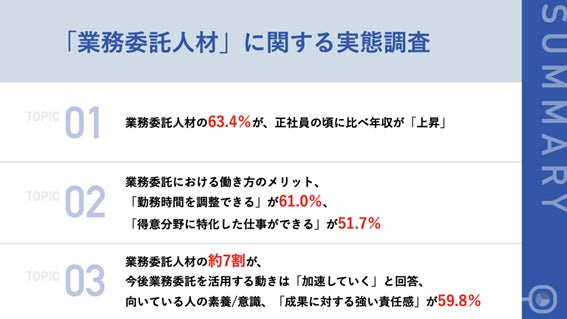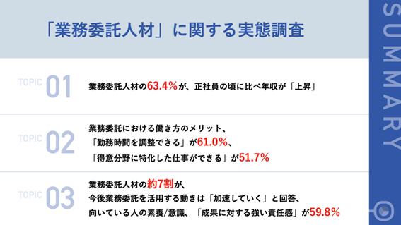 今回の調査では、業務委託として働いている多くの人が、安定性にかける等の課題はありつつも、勤務時間や仕事・収入の調整ができ得意分野を活かして活躍できるというメリットを実感していることが判明しました。また彼らの強みは、得意分野を活かしているということに加えて、従業員として働いていた時以上に、成果に責任を持って案件に向き合う姿勢を持っているところにあると考えられます。より安定を確保するために業務委託に「案件の紹介」をしてくれるサービスへの関心が高まっており、業務委託人材の多くが「今後企業が業務委託人材を活用する動きは加速していく」と考えていることも踏まえると、個々人のスキルにマッチした充分な案件確保を支援するサービスの存在が、業務委託として働く人たちを更に増やし、活躍の幅を広げるための鍵となると言えるでしょう。
