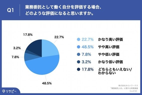 「Q1.業務委託として働く自分を評価する場合、どのような評価になると思いますか。」(n=410)と質問したところ、「かなり高い評価」が22.7%、「やや高い評価」が48.5%という回答となりました。