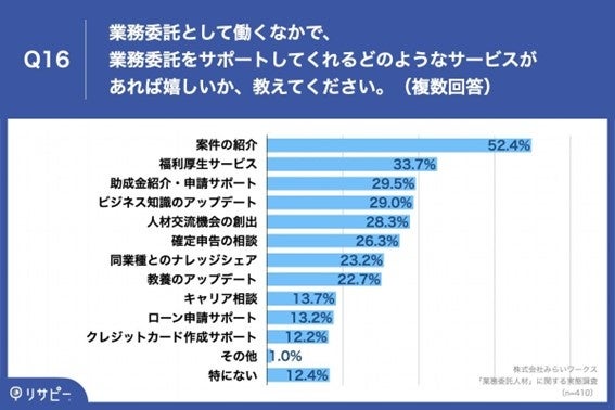 「Q16.業務委託として働くなかで、業務委託をサポートしてくれるどのようなサービスがあれば嬉しいか、教えてください。(複数回答)」(n=410)と質問したところ、「案件の紹介」が52.4%、「福利厚生サービス」が33.7%、「助成金紹介・申請サポート」が29.5%という回答となりました。