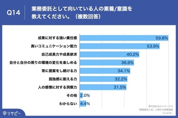 「Q14.業務委託として向いている人の素養/意識を教えてください。(複数回答)」(n=410)と質問したところ、「成果に対する強い責任感」が59.8%、「高いコミュニケーション能力」が53.9%、「自己成長力や成長欲求」が40.2%という回答となりました。