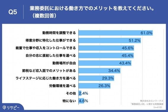 「Q5.業務委託における働き方でのメリットを教えてください。(複数回答)」(n=410)と質問したところ、「勤務時間を調整できる」が61.0%、「得意分野に特化した仕事ができる」が51.2%、「裁量で仕事や収入をコントロールできる」が45.6%という回答となりました。