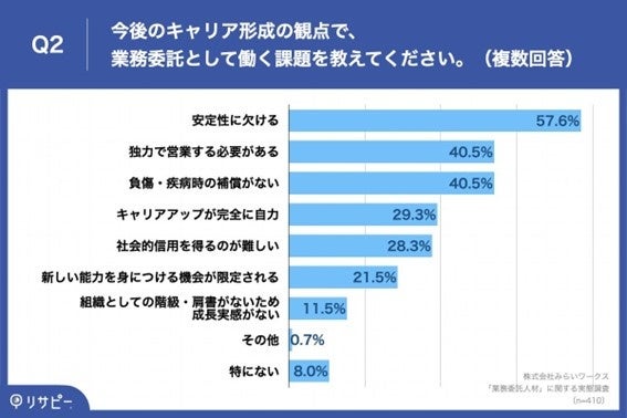 「Q2.今後のキャリア形成の観点で、業務委託として働く課題を教えてください。(複数回答)」(n=410)と質問したところ、「安定性に欠ける」が57.6%、「独力で営業する必要がある」が40.5%、「負傷・疾病時の補償がない」が40.5%という回答となりました。