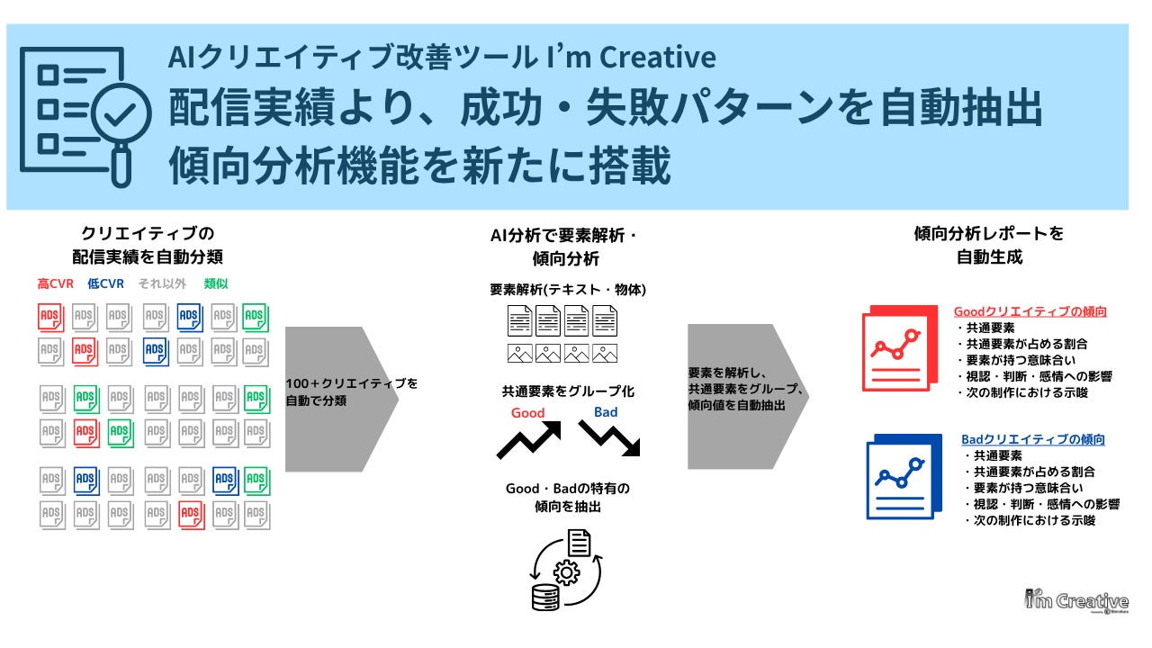 AIクリエイティブ改善ツール「I’m Creative」、過去配信したクリエイティブ実績から、成功・失敗パターンを自動で発見する「傾向分析レポート機能」を新たに搭載