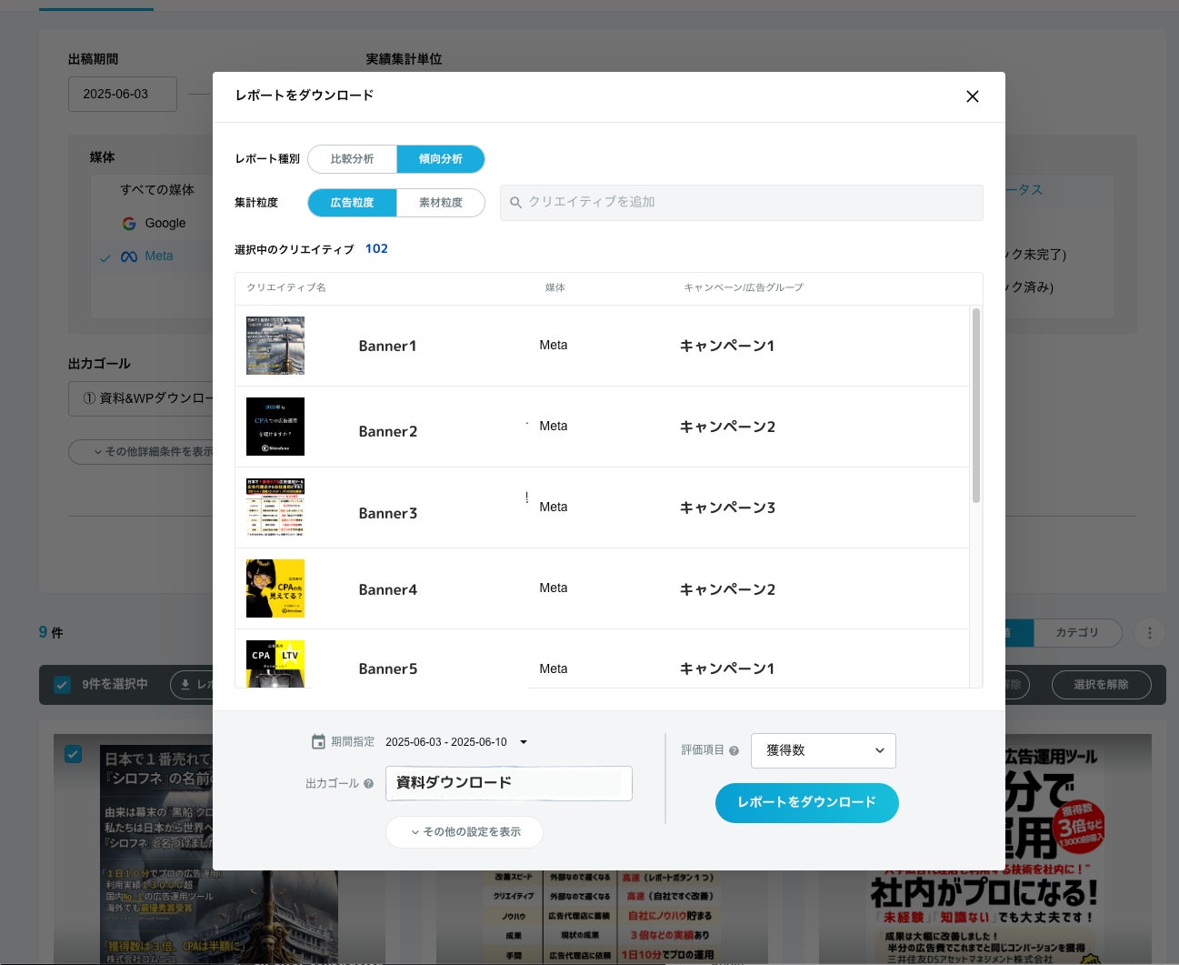 特徴① 3つの選択だけで過去配信した広告クリエイティブの実績を一括分析