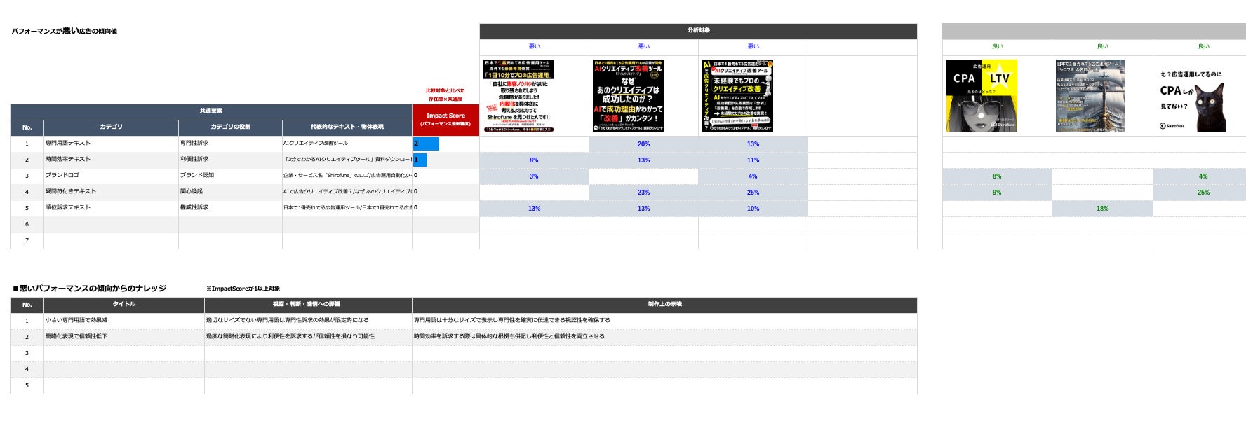 本機能は、Shirofuneが大量のクリエイティブ分析で培った独自のパターン認識技術を活用。単発の広告分析では発見できない、大量データから浮かび上がる統計的に有意な成功法則を、実用的なレポート形式で提供します。