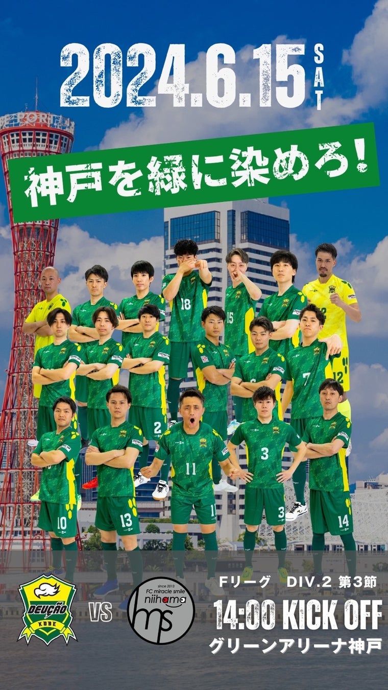 デウソン神戸が6/15のFリーグホーム開幕戦、観客動員1000人プロジェクト「神戸を緑に染めろ」およびクラウドファンディングを実施中