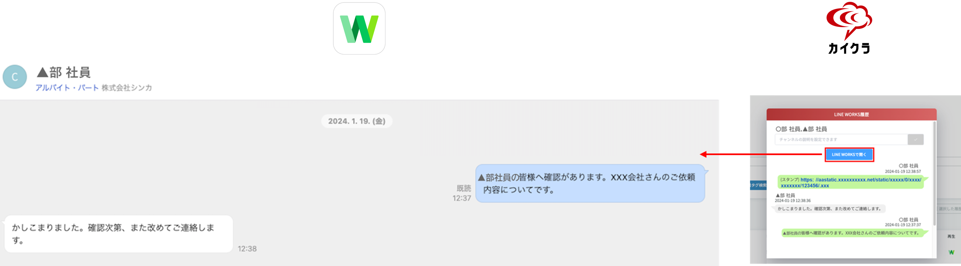 本連携により、カイクラ上でLINE WORKSのトーク履歴を一元管理することが可能になります。各ユーザーのコミュニケーションを明確に把握することができるようになるため、社内での情報共有や業務引き継ぎ時の情報漏れを防止します。