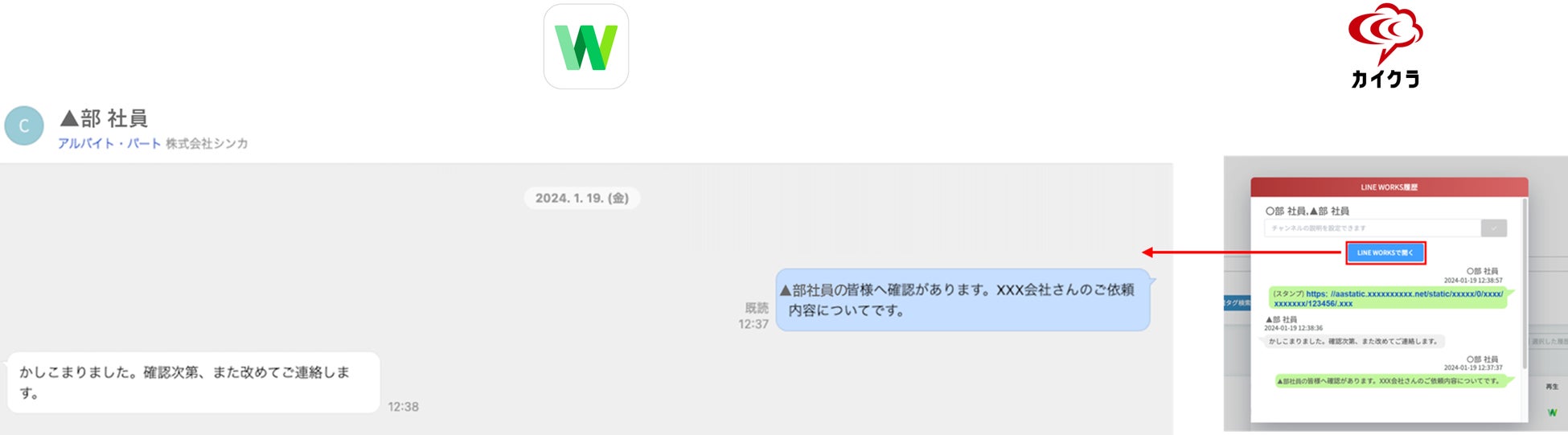 さらに、LINE WORKSサービスのトークルームを呼び出すことも可能です。