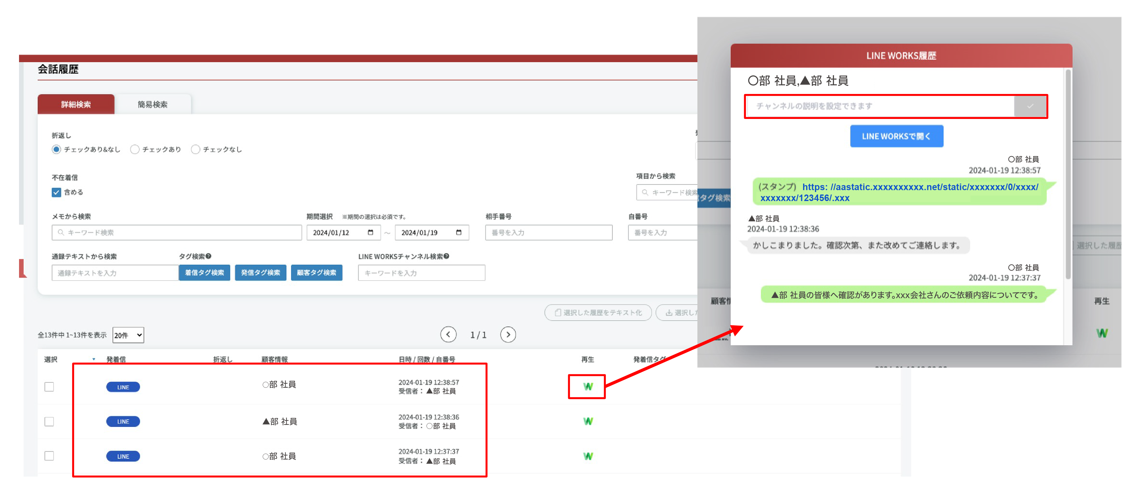 従来の固定電話、携帯電話・メール・SMS・ビデオ通話の履歴にLINE WORKSのトーク履歴を加えた、あらゆる顧客コミュニケーションの履歴を一元管理し、さらに社員同士のコミュニケーション履歴も管理できるため、情報共有や業務の引継ぎなどを効率的に行うことができるようになります。