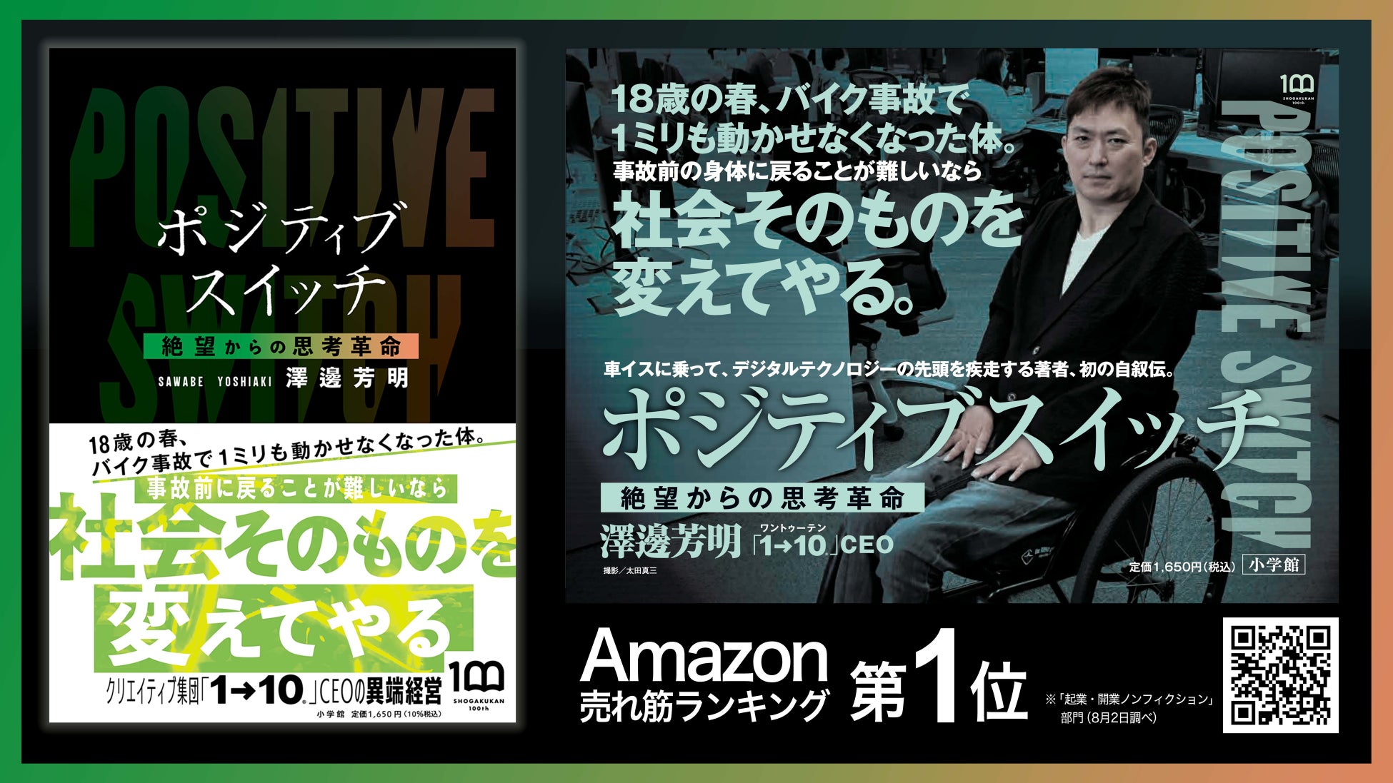 この特別対談は各分野で活躍するトップランナーを招いてワントゥーテンCEOの澤邊芳明が「ポジティブスイッチ」というテーマで対談するシリーズ企画で、コピーライター佐々木圭一氏、小学館編集者の柏原航輔氏を招いた対談動画も公開中です。この対談シリーズは、8月に小学館より発売され、Amazon 売れ筋ランキング「起業・開業ノンフィクション」部門 第1位(8月2日調べ)を獲得した「ポジティブスイッチ 絶望からの思考革命/澤邊芳明(著)」の刊行を記念して実施されます。