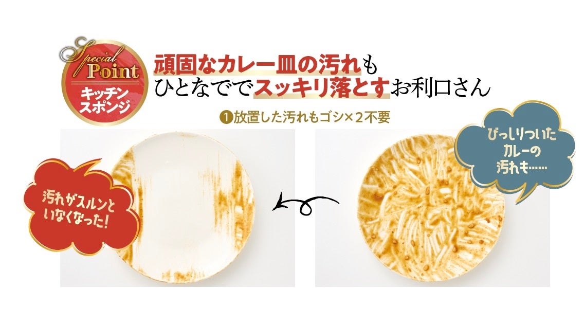 特殊な形状のスポンジが食器にしっかりフィットし、抜群の洗浄力を発揮! カレー汚れを放置したお皿を、ひとなででピカピカにする洗浄力は圧巻です。平たくやわらかいのでスポンジ&クロスのいいとこ取りができ、フックを使えば吊り下げ可能なのも便利です。