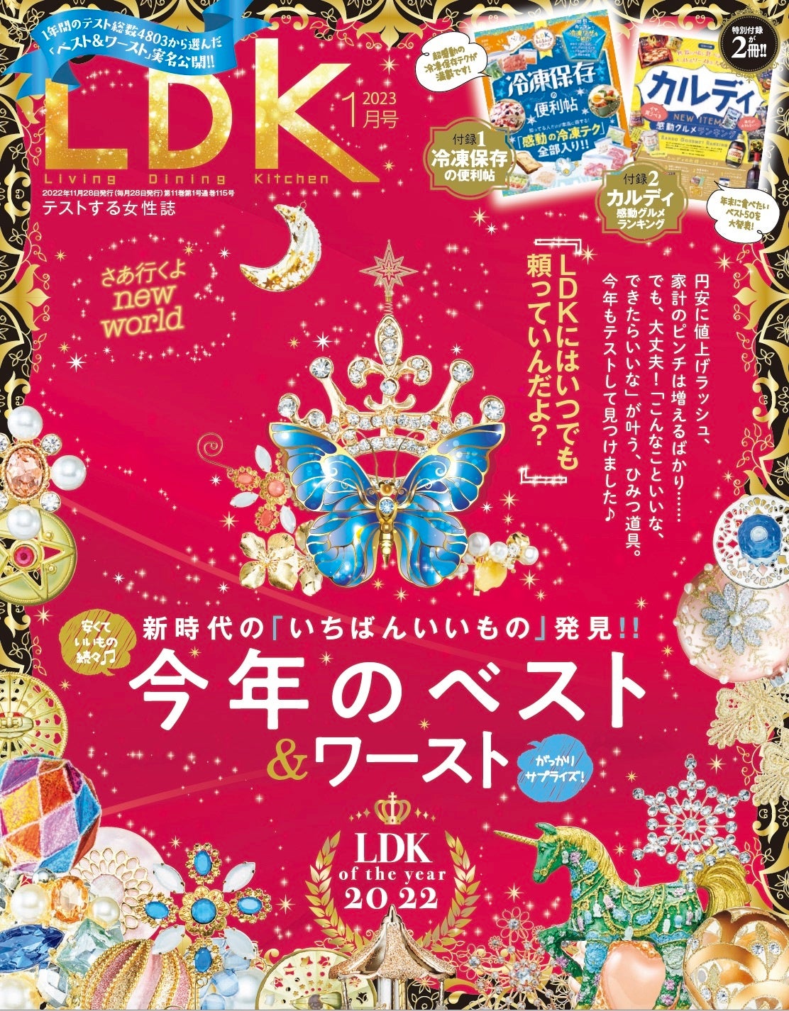 1月号では、1年間で4803個の製品を2270時間かけてテストした中から見つけた“本当にいいもの”だけを集めて大発表!収納・インテリア、食品・キッチンツール、洗濯・掃除、スキンケア、生活用品など、実力だけを評価した心から推せる「いちばんいいもの」をぜ〜んぶ隠さずご紹介。さらに、「冷凍保存の便利帳」と「カルデイ感動グルメランキング」が付録として2冊もついてくる今年イチおトクで最高な号です!