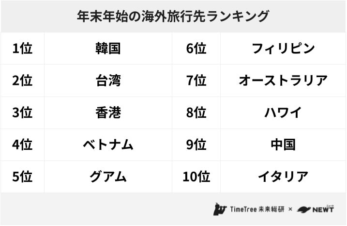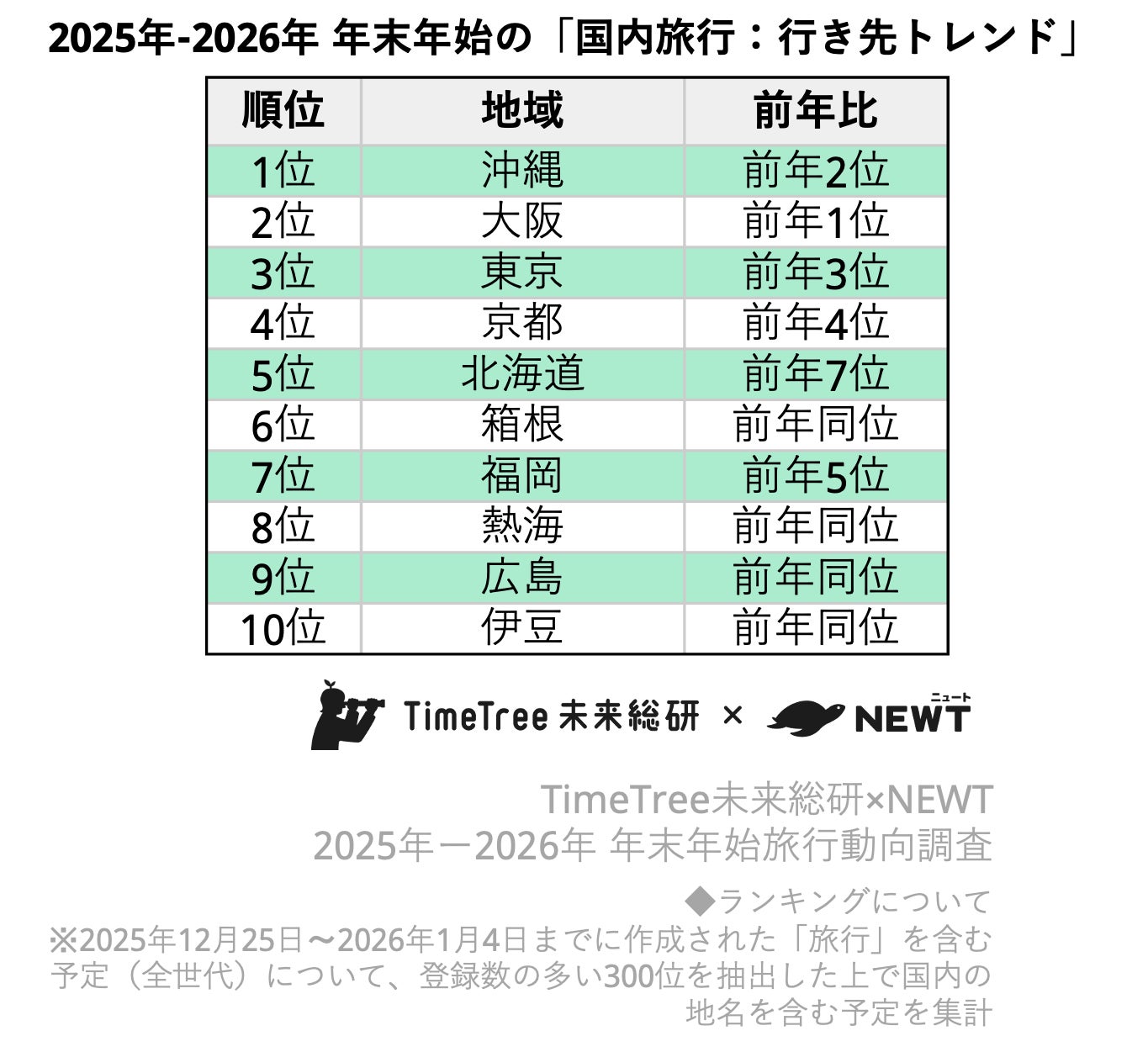 TimeTree未来総研×NEWT「予定データ」と「予約データ」から読み解く2025年-2026年 年末年始旅行動向 今年の年末年始、日本人はどこへ行く?国内外行き先予定ランキング発表!