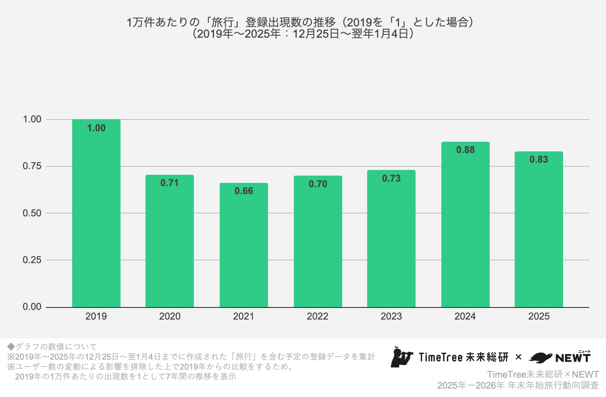 株式会社TimeTree(本社:東京都新宿区、代表取締役社長:深川 泰斗)の社内研究所『TimeTree未来総合研究所』(https://timetreeapp.com/intl/ja/future-research-institute)と株式会社令和トラベル(本社:東京都渋谷区、代表取締役:篠塚 孝哉)が運営する、かしこい、おトク、旅行アプリ『NEWT(ニュート)』は、共同で2025年〜2026年・年末年始の旅行動向を分析しました。TimeTree未来総研は、年末年始(2025年12月25日〜2026年1月4日)に登録された「旅行」を含む予定データを分析し、旅行アプリ『NEWT』は同アプリにおける予約データを解析しました。