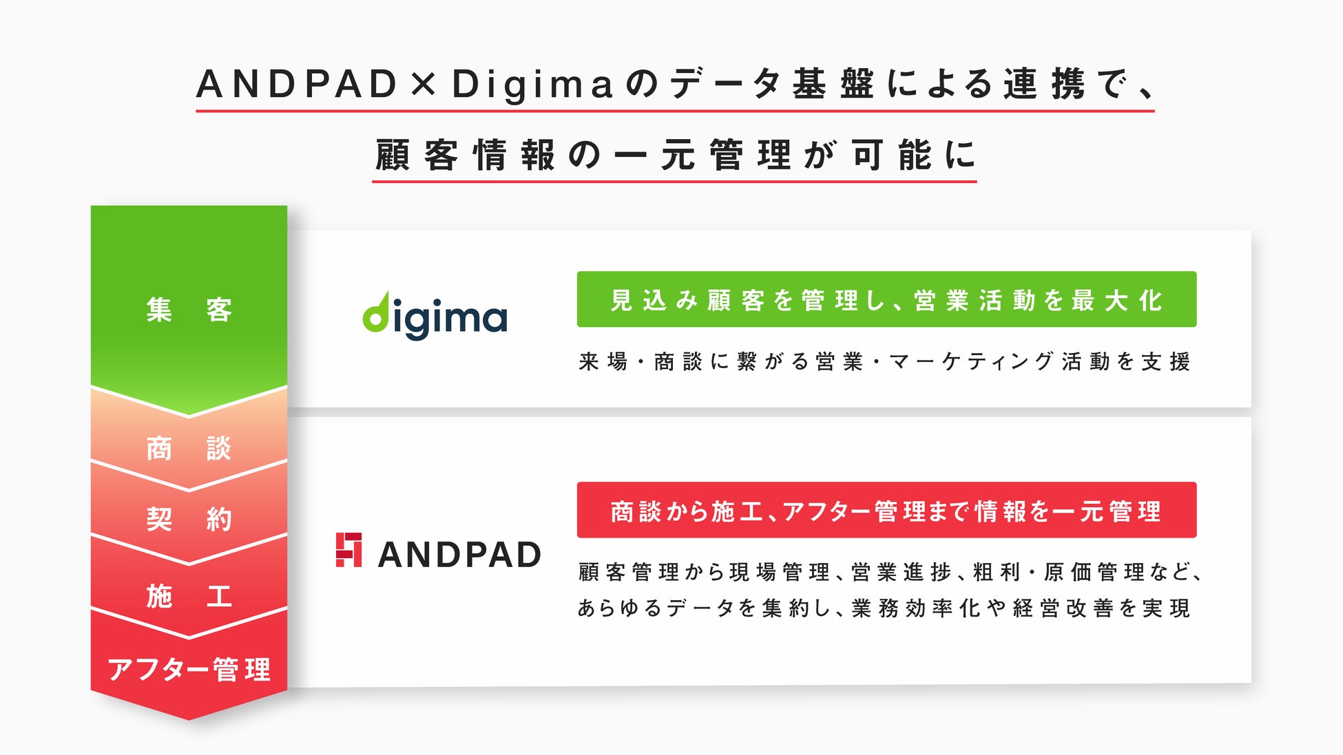 クラウド型建設プロジェクト管理サービス「ANDPAD」を運営する株式会社アンドパッド(本社:東京都千代田区、代表取締役:稲田武夫、以下アンドパッド)と、住宅・不動産業界に特化したマーケティングオートメーションツール「Digima」を運営する株式会社コンベックス(以下コンベックス)はこの度、双方が提供するサービス「ANDPAD」と「Digima」間のシステム連携(β版)を開始いたします。
