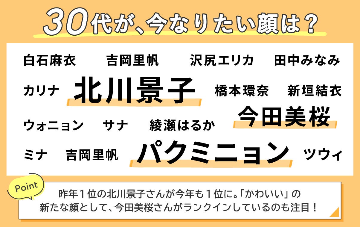 2023年のトレンドとして「ピュア」「童顔」「かわいい」といったキーワードが挙げられますが、昨年の20代のなりたい顔を見ても「かわいらしさ」がキーワードになっていること、今年のTOP3の傾向からも20代ユーザーが求める「なりたい顔」は「かわいい」が重要なファクターになっている模様です。