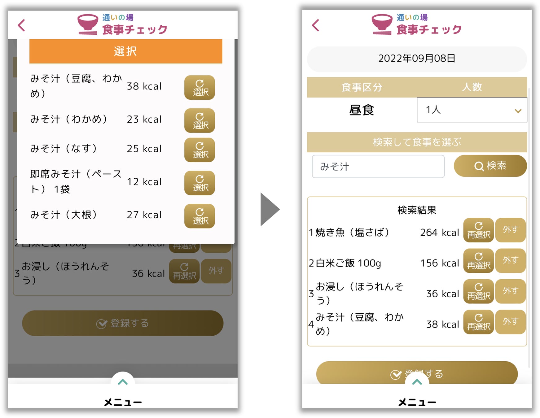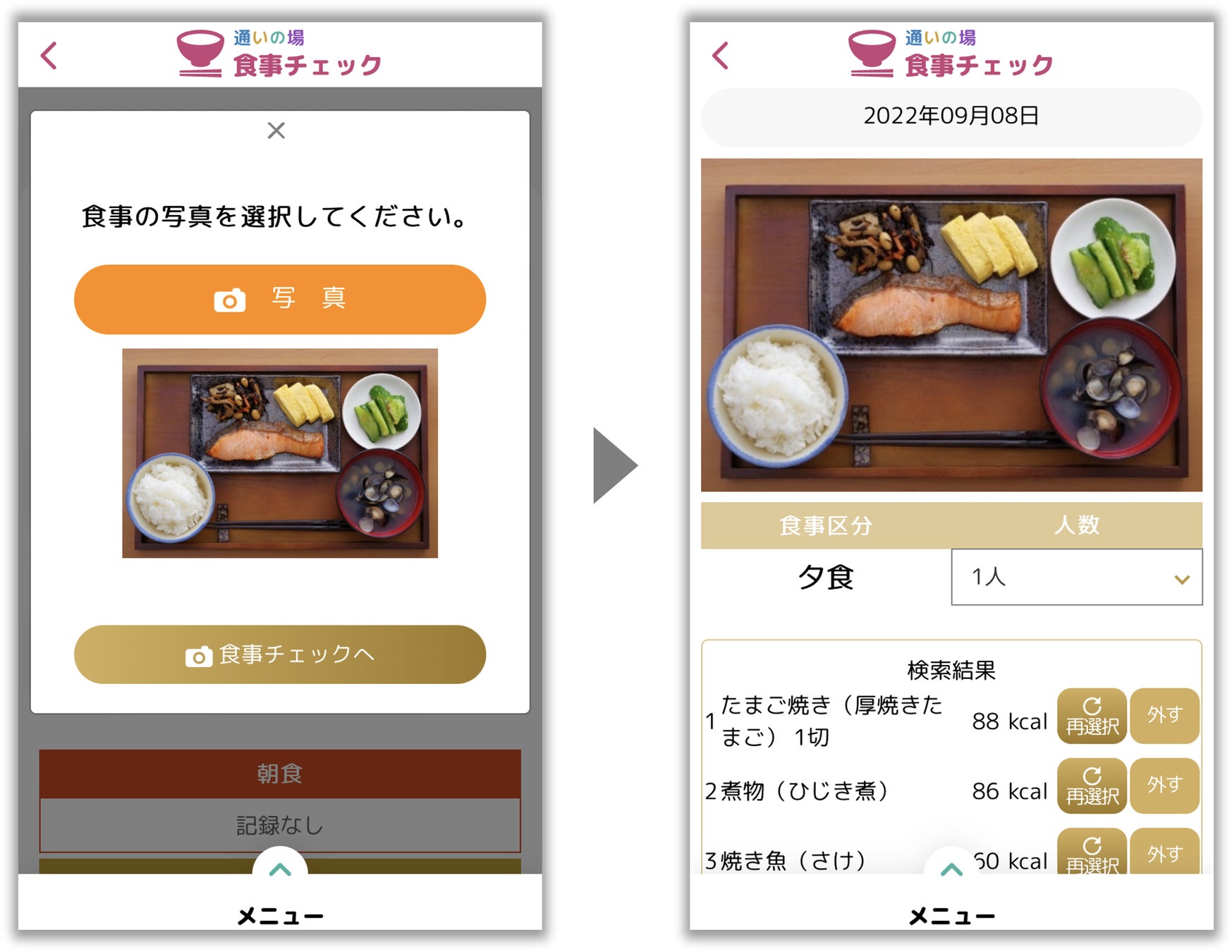 参画の背景:リニューアル前の「オンライン通いの場」アプリは、元々食事管理機能がありましたが、記録のみで栄養価計算はできませんでした。そこで、写真を撮るだけで高齢者でも簡便に食事記録ができるカロミルAPIを導入することで、摂取した栄養価まで確認でき、健康的な食生活への行動変容を促すアプリへと進化しました。