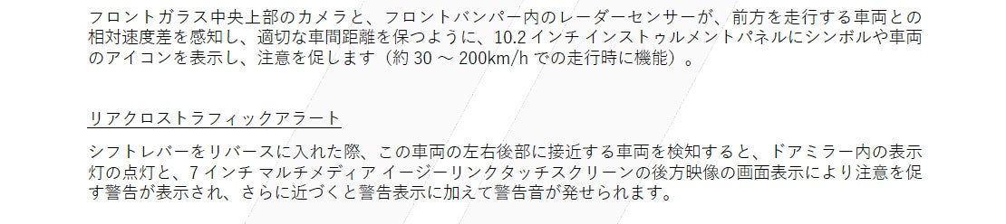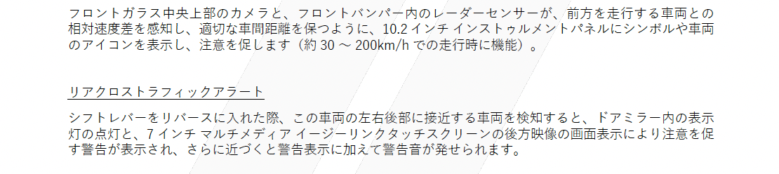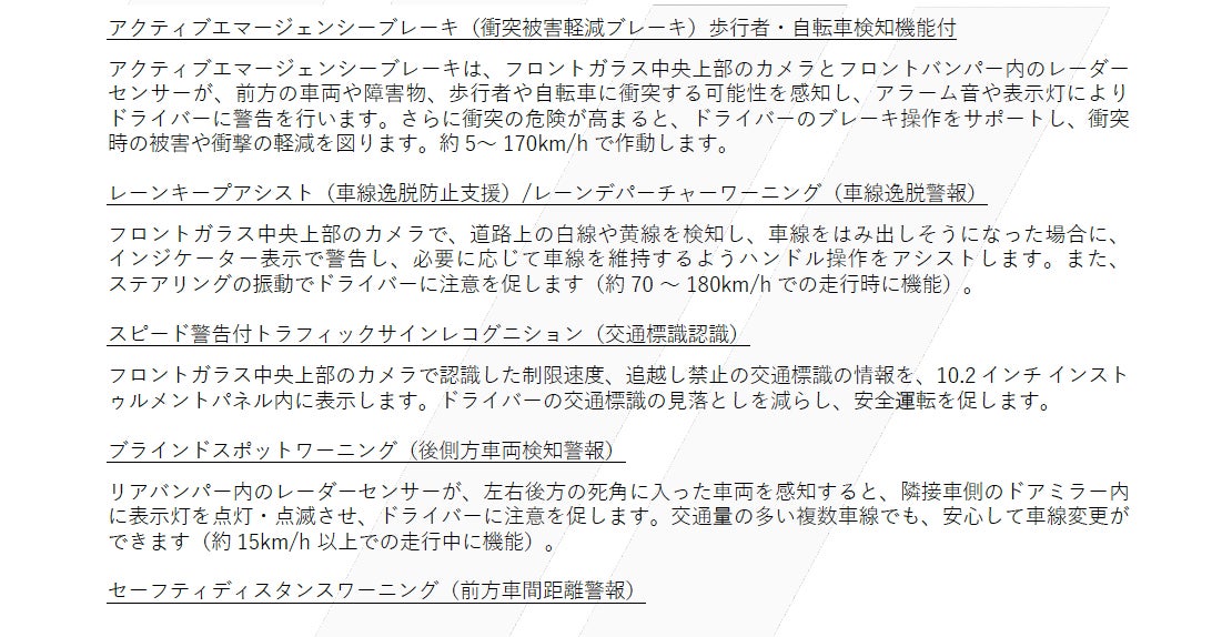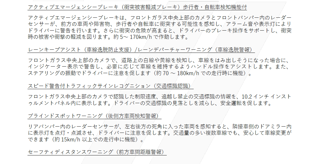 道路上の車両や障害物、歩行者、自転車をレーダーとカメラで感知し、ドライバーの衝突回避行動をサポートし、衝突被害を軽減します。
