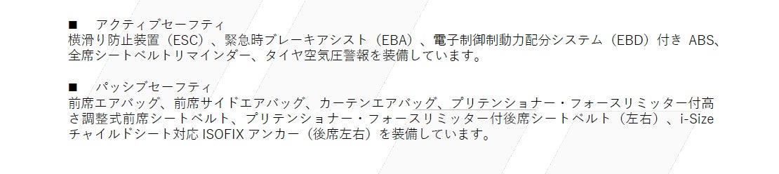 ドアトリムとダッシュボードには、カーボン調パネルを採用し、レッドラインのアクセントがスポーティな印象を高めています。レザー×スエード調コンビ6ウェイ電動フロントシート、レザーステアリングホイール、そしてシートベルトにも施されたレッドステッチが、スポーティさに加えて上質さを感じさせます。フロントシートとレザーステアリングには、ヒーターが装備されています。