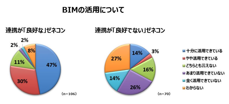 「あなたが担当する業務案件ではBIMを十分に活用していると言えますか?」という設問に対し、自社のDX推進部門と連携が「うまくいっている」と答えたゼネコンの77%が「活用できている」と回答しました。