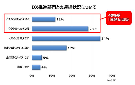 ゼネコン各社に「自社のDX推進部門(BIM推進部門、デジタル推進部門)との連携状況はどれにあてはまりますか?」というアンケートを行った結果、40%が「うまくいっている」と回答しました。
