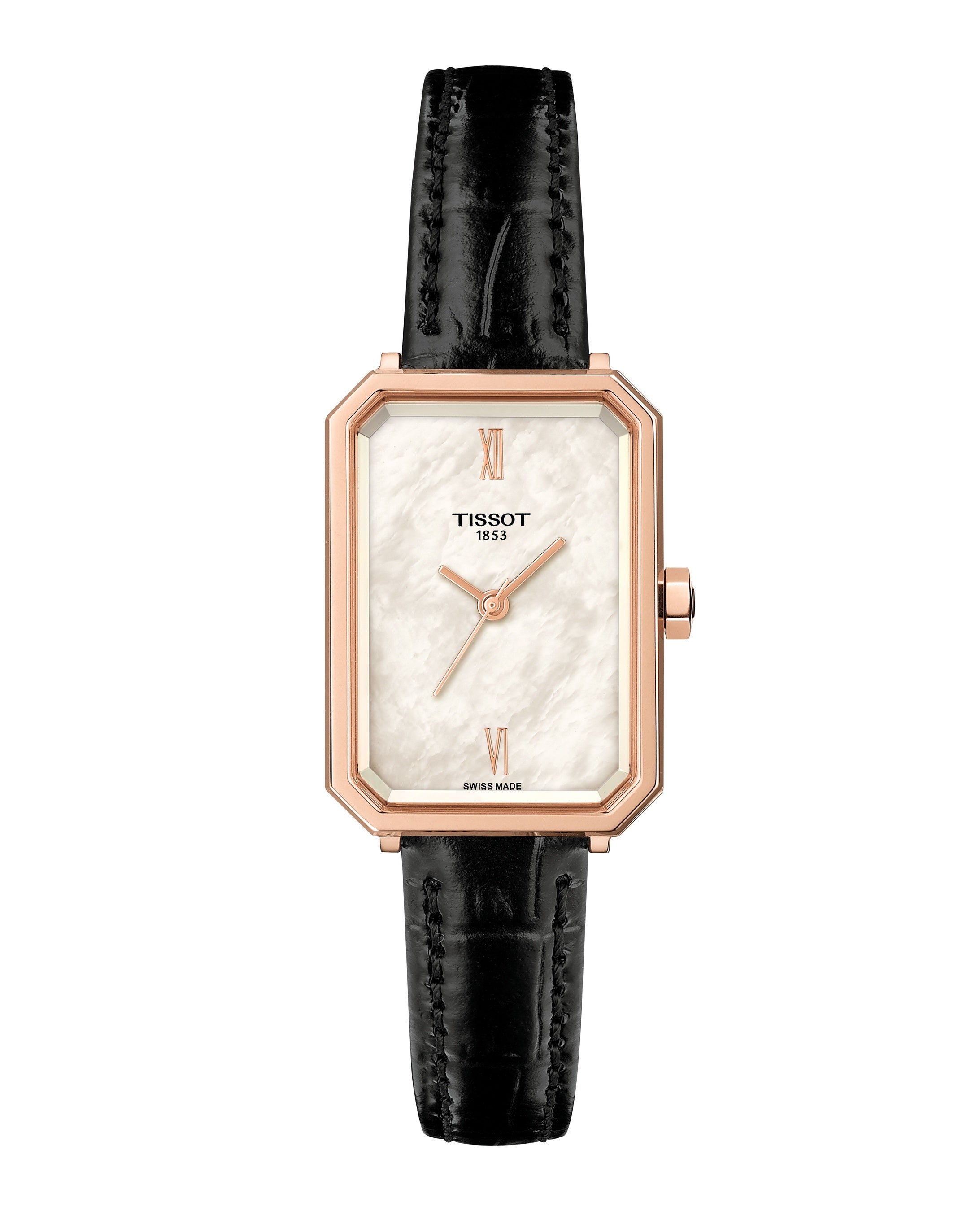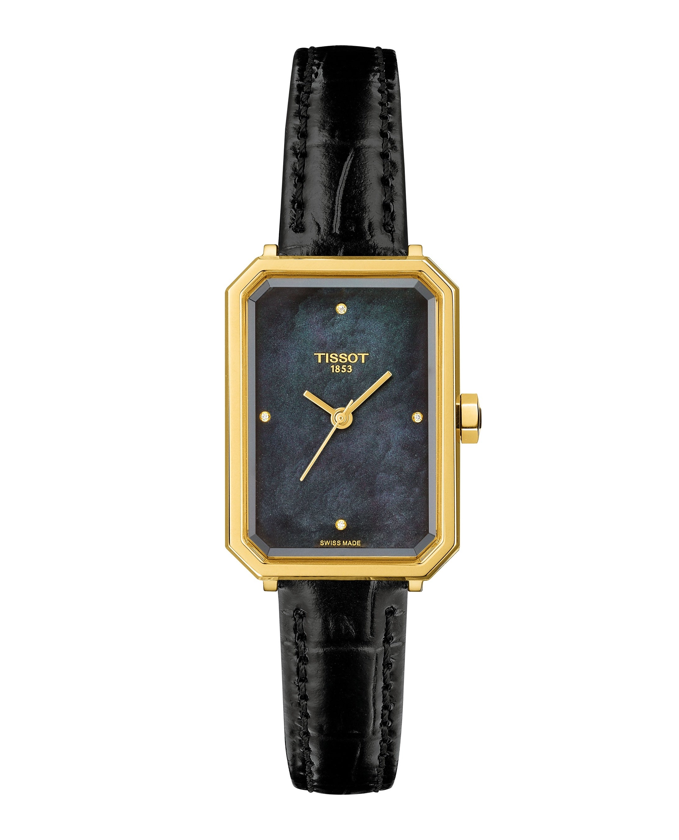 ホワイトマザーオブパールにベージュゴールドPVDケースを組み合わせたモデル(T160.110.36.113.00)と、文字盤に4石のダイヤモンドをあしらったブラックマザーオブパールにイエローゴールドPVDケースを合わせたモデル(T160.110.36.126.00)をラインナップ。どちらも、気品あるブラックレザーストラップが印象を引き締めます。