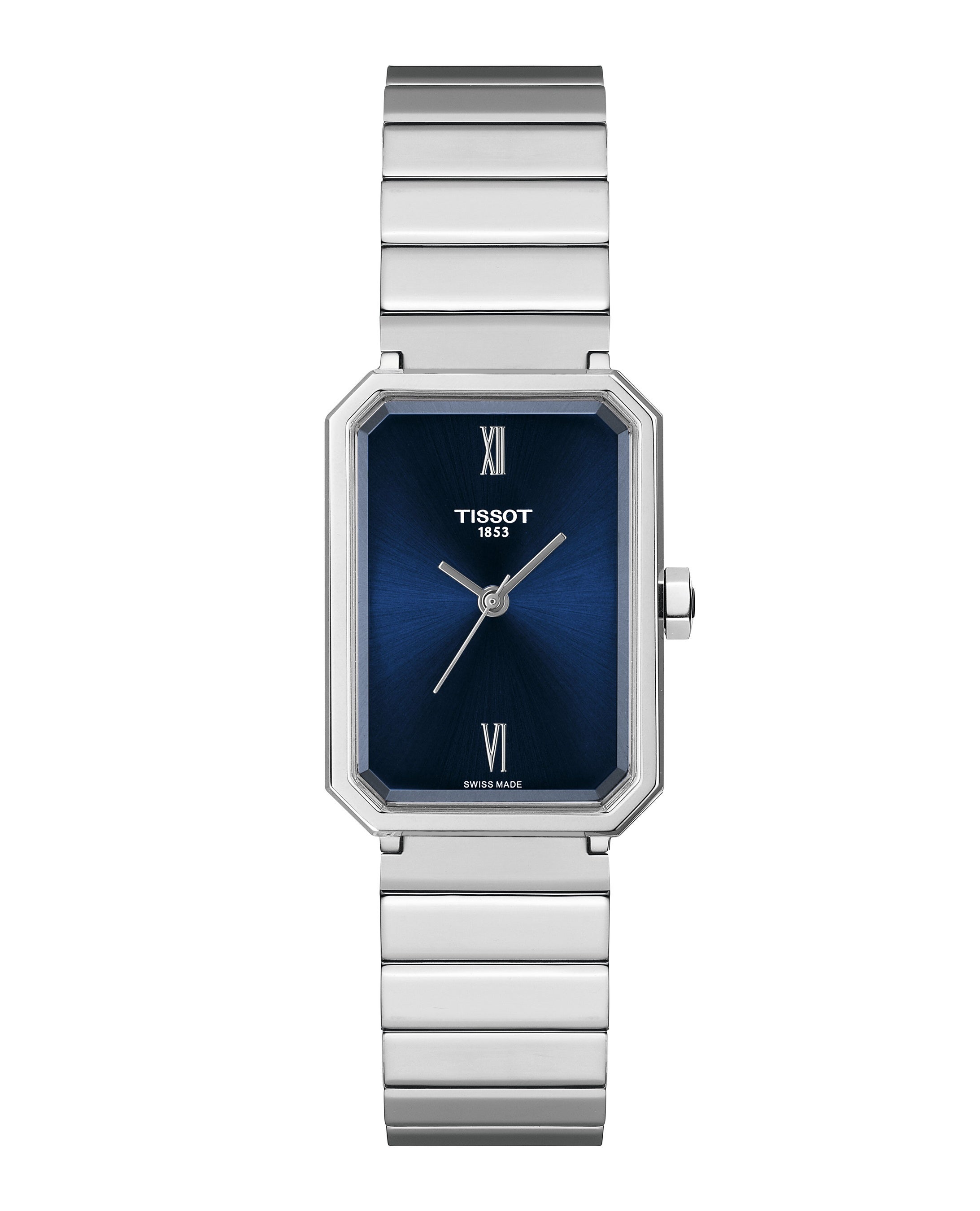 ステンレス製モノリンクブレスレットを採用した2つのモデルは、SRVコレクションの中でもひときわ存在感を放ちます。先細りのリンクは、彫刻のような美しいケースと調和し、光沢仕上げやバタフライクラスプ、そしてスタイルに合わせて簡単に付け替え可能なクイックチェンジシステムを備えているのも魅力です。サンレイ仕上げが施された、洗練されたシルバー(T160.110.11.033.00)と深みのあるブルー(T160.110.11.043.0)の文字盤は、それぞれがシックな装いにエレガンスを添えます。