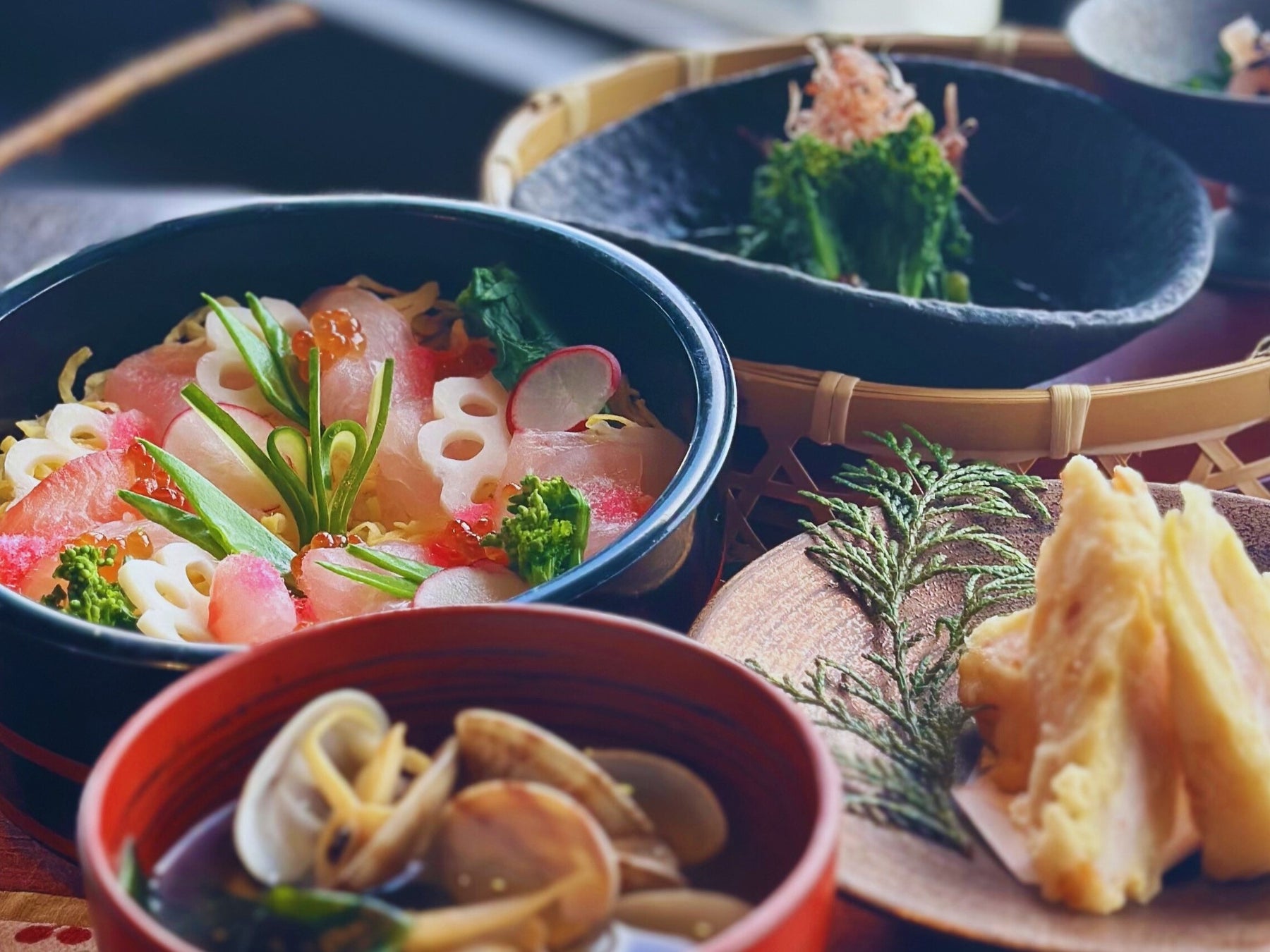 春子(小鯛)の昆布締め彩りちらし寿司 筍の海老真丈挟み揚げ 菜の花のお浸し 浅蜊と生若布のお味噌汁 <春酒2種の試飲付> おだやか 純米吟醸うすにごり生酒 月の輪 特別純米原酒花見酒 |