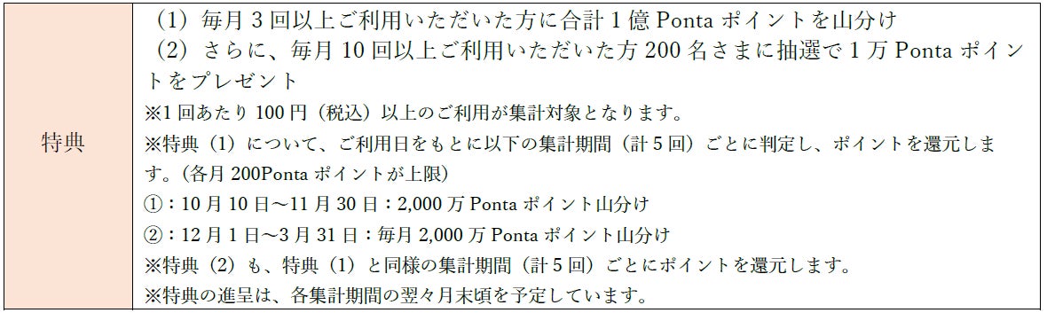 本キャンペーンでは、エントリーのうえ「au PAY カード」「au PAY ゴールドカード」を毎月3回以上ご利用のお客さまを対象に、総額1億Pontaポイントを山分けで還元します。さらに、キャンペーン期間中に毎月10回以上ご利用いただいたお客さまの中から、抽選で毎月200名さまに1万Pontaポイントをプレゼントします。