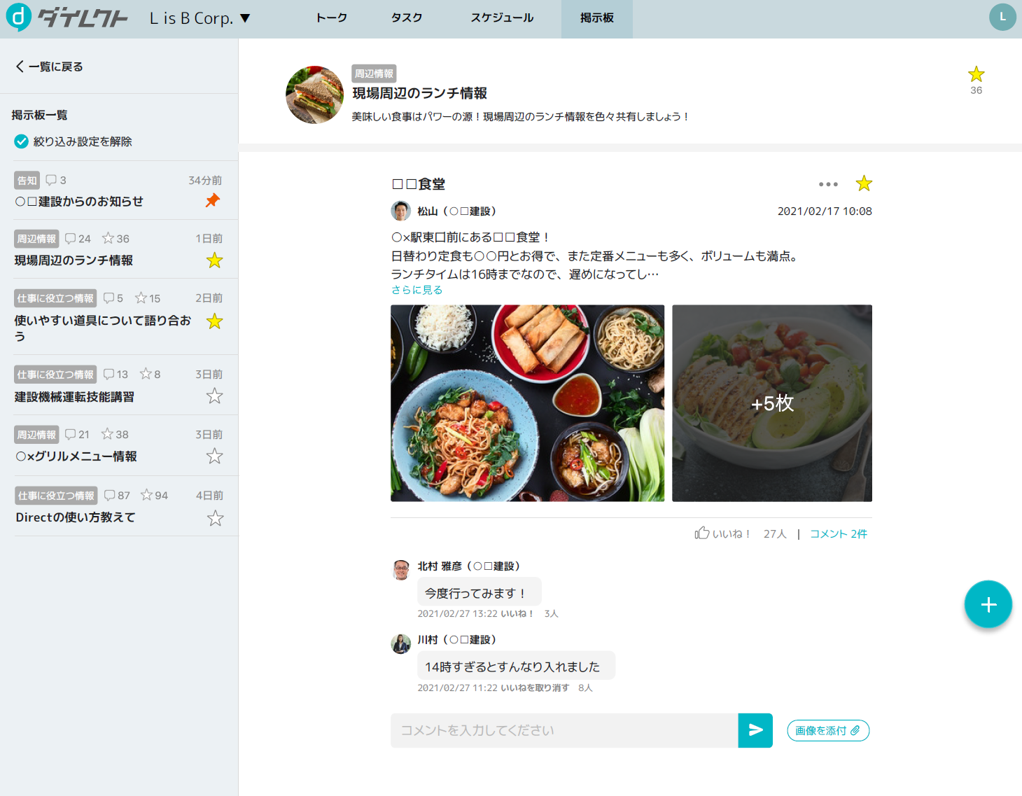 現場で共有したい業務ノウハウや従業員や協力会社のスタッフに直接伝えるお知らせを掲載することができる掲示板。トピックスを投稿した際、閲覧者から「いいね!」をつけることができ、メッセージだけでなくPDFや写真などのファイル形式も投稿することが可能です。