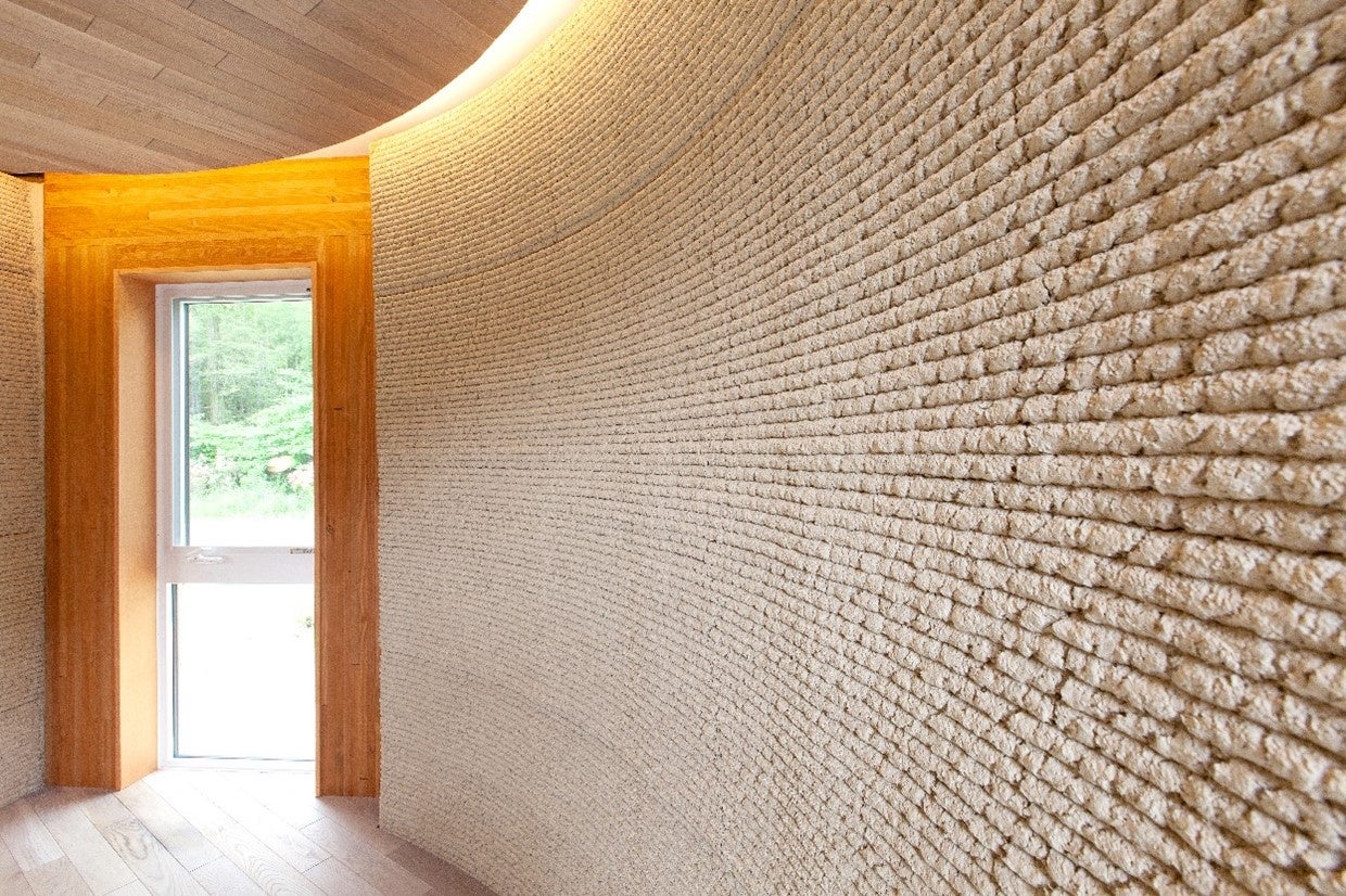 土を主原料とした当モデルハウスの工期は、3Dプリンティングに2週間(延べ72時間)、木工時に2週間、そのほかの工事を合わせて合計3カ月。3Dプリンティングの材料は土が約75%を占めており、そのほか結合剤として石灰やセメント、繊維材として藁、骨材としてもみ殻を混ぜ合わせたものを使用しています。