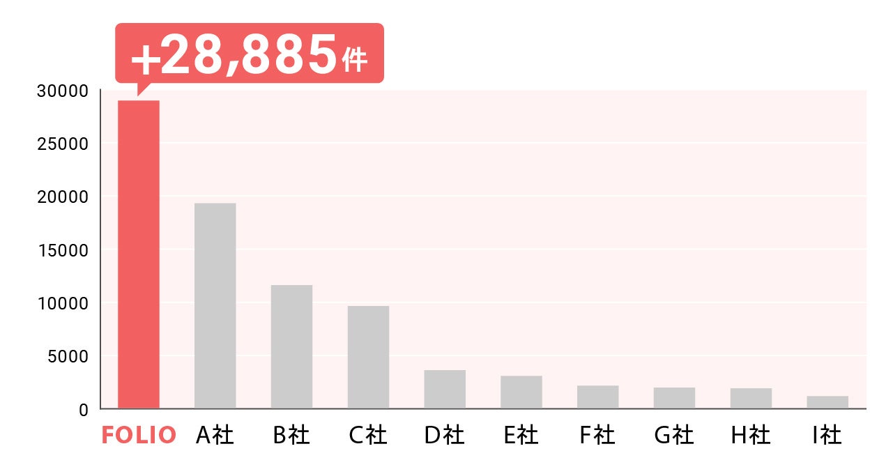 下表は2023年度上半期の「ラップ業務」にかかる投資一任契約における主要10社(※2)の契約増加件数です。FOLIOが+28,885件で第1位(※1)となりました。なお、当社は2023年11月時点での運用資産残高が1,000億円を突破し、投資一任契約件数と合わせて、運用資産残高も順調に増加してまいりました。当社が提供するサービスや、当社と連携している各金融機関のサービスを通じて、より多くの皆さまの資産形成に貢献できるよう努めてまいります。