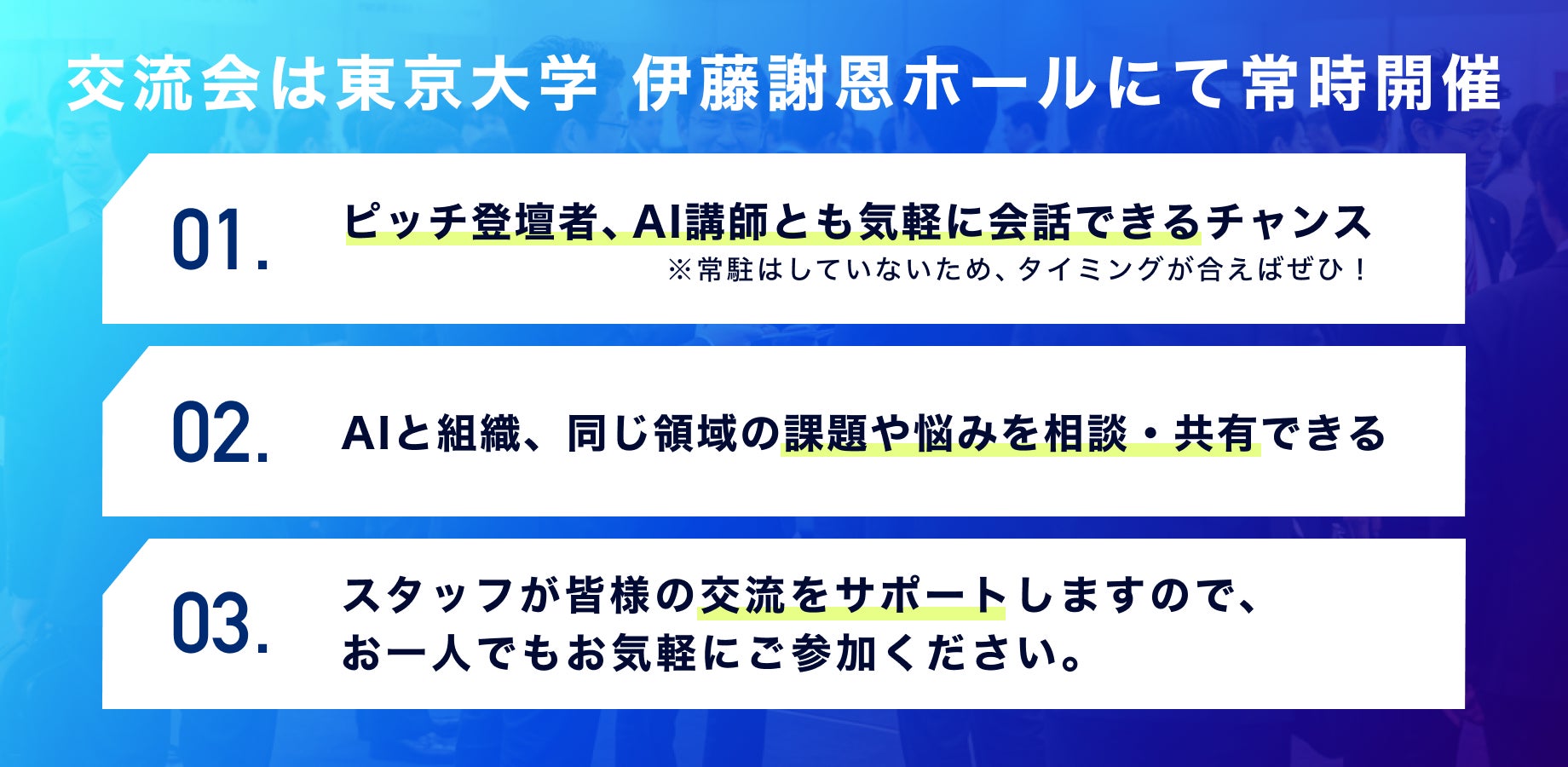 本イベントの参加者同士の繋がりを最大化する「交流エリア」をご用意しております。
