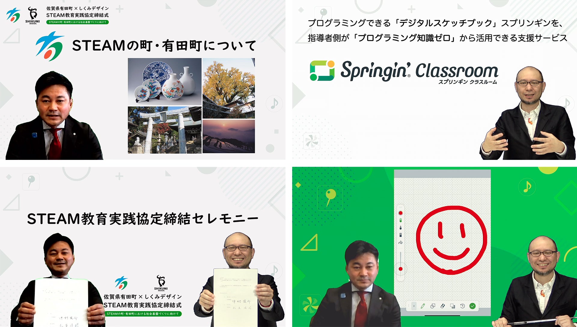 子どもたちが当たり前にプログラミングを学ぶ時代に突入した現代において、プログラミングそのものを学んだことのない教育者向けに、知識ゼロからプログラミング指導が可能になる「Springin’ Classroom(スプリンギン クラスルーム)」を2021年11月に事業発表。そしてこの度、Springin’ Classroomを活用し、STEAMの町として町全体でSTEAM教育を推進する佐賀県有田町における社会基盤づくりに向けた「STEAM教育実践協定」を締結することが決定し、2月3日(木)に有田町としくみデザインオフィスをオンラインで繋ぎ、締結式を実施いたしました。