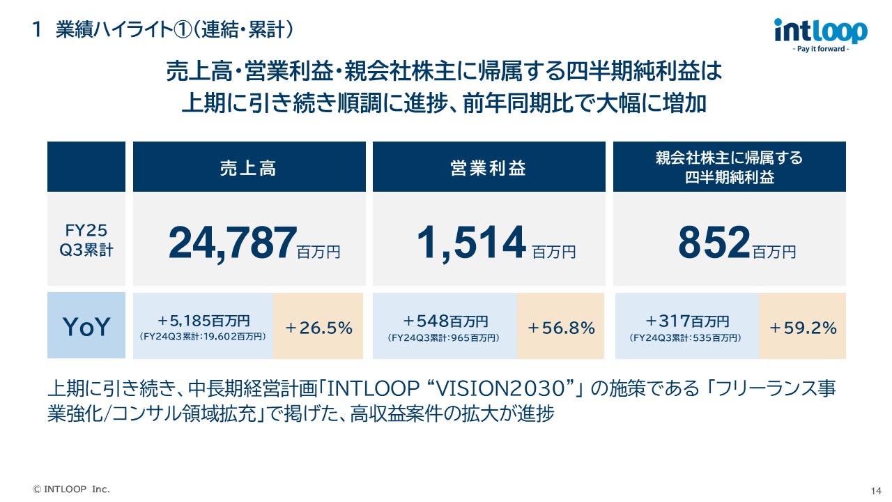 背景には、上期に引き続き、2024年9月に発表した中長期経営計画「INTLOOP‟VISION2030”」の施策、「フリーランス事業強化/コンサル領域拡充」で掲げた高収益案件*の獲得が進捗したことが挙げられます。
