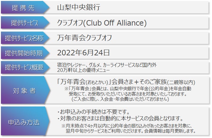 福利厚生アウトソーシングサービスのトップカンパニーである株式会社リロクラブ(本社:東京都新宿区、代表取締役:岡本 盛 https://www.reloclub.jp/cs-solution/)は、株式会社山梨中央銀行(本店:山梨県甲府市、頭取:関 光良 https://www.yamanashibank.co.jp/)から年金を受け取られているお客さま(以下、「万年青会」)がご利用いただけるサービスの刷新に伴い、会員限定優待サービス「クラブオフ(Club Off Alliance)」の提供および運営を2022年6月24日より開始することをお知らせいたします。