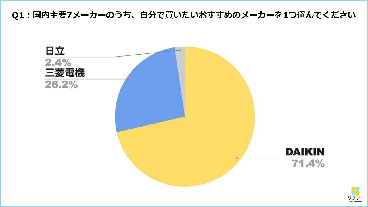 1位はダイキンで71.4%という圧倒的な評価を得ました。2位は三菱電機26.2%、3位は日立2.4%となり、3社に集中する結果となりました。