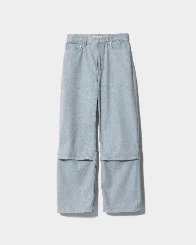 膝から裾までが太いワイドストレートシルエットの5ポケットデニムパンツ。ひざ下の切替えを脇と股下で互い違いに縫い合わせた構造パターンが特徴です。裾を裏表ひっくり返すことで、インサイドアウトのバイカラーに変化します。裾をターンアップしたかのようなトロンプルイユデザインとしても着用が可能。