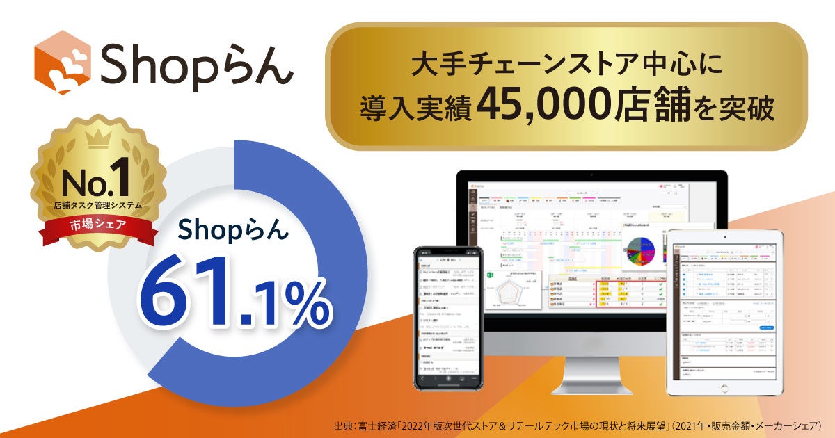 ドリーム・アーツのShopらん(R)、市場シェア61%でNo.1(※1)獲得〜「2022年版次世代ストア&リテールテック市場の現状と将来展望」の店舗タスク管理システム市場調査にて〜