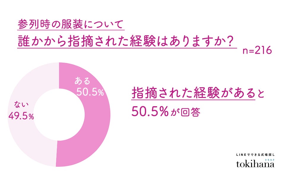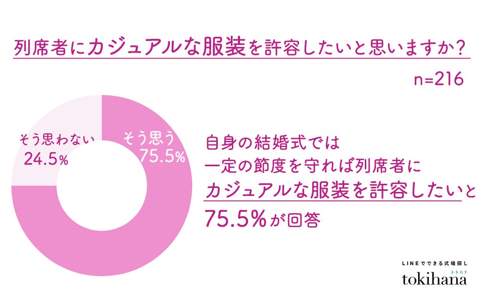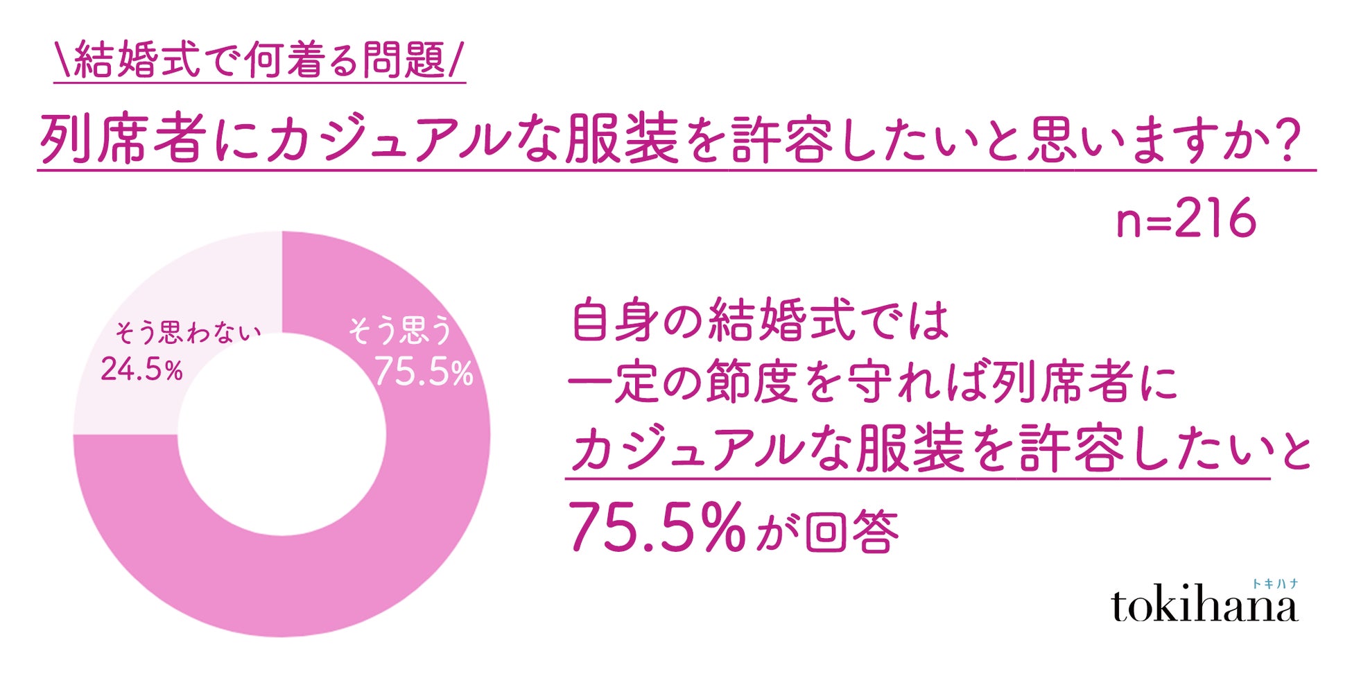 LINEでできる式場探し『トキハナ( https://tokihana.net/ )』を運営する株式会社トキハナ(本社:東京都港区、代表取締役社長:安藤 正樹、以下 「トキハナ」)は、インターネットリサーチにより、結婚式を実施した20〜30代の男女216人を対象に調査を行ったところ、主催者の75.5%が「節度を守れば参列者はカジュアルな服装でも問題ない」と考えていることが分かり、服装の自由度を受け入れる意識が高まりつつある一方で、参列時の服装について「誰かから指摘を受けたことがある」と回答した人は50.5%にのぼりました。